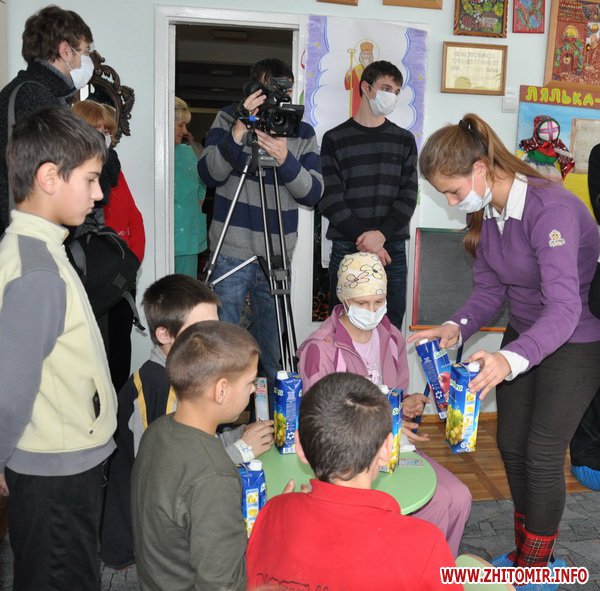 У Житомирській обласній дитячій лікарні школярі та студенти зустрілися з маленькими пацієнтами, подарували їм медові миколайчики, печиво, сік і матеріали для арт-терапії (олівці, фарби, альбоми тощо).