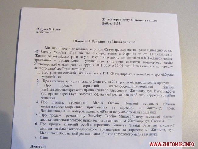 Как стало известно Житомир.info, сейчас к забастовщикам направляются депутаты Житомирского городского совета от трех оппозиционных сил: «Батьківщина», «Свобода» и «Фронт змін». По инициативе ВО «Свобода», депутаты подписали обращение к мэру Дебою о созыве 24 декабря внеочередной сессии горсовета для решения проблем Житомирского ТТУ.