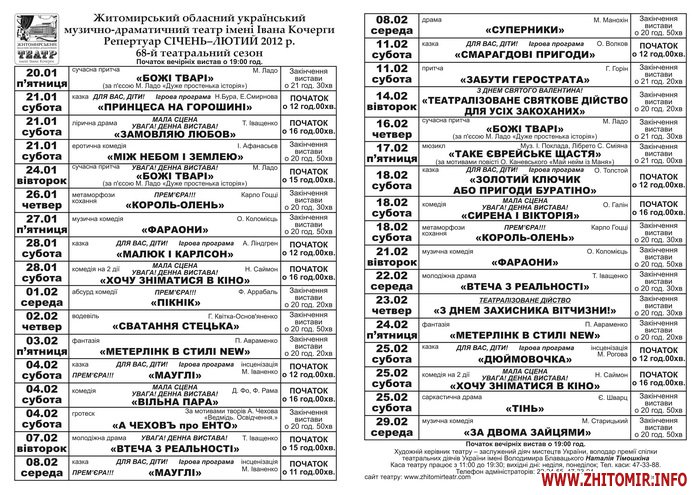 Житомирський обласний український музично-драматичний театр імені Івана Кочерги представив репертуар на січень-лютий 2012 року. Зараз триває 68 театральний сезон.