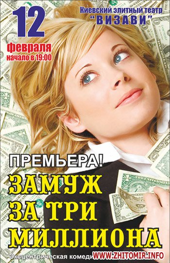 В воскресенье,12 февраля, киевский элитный театр «Визави» представит в Житомирском облмуздрамтеатре им. И. Кочерги супер-комедию «Замуж за три миллиона», - сообщает Афиша Житомира.