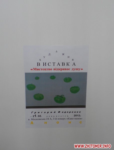 21 лютого в арт-просторі «Ти диви!» від «Кавоманія» відкрилась метафізична виставка житомирського художника Григорія Федоренка.