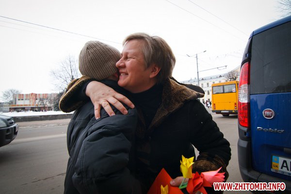 В центре Житомира, на улице Большой Бердичевской, сотрудники ГАИ вместе со школьниками поздравляли женщин-водителей с наступающим 8 марта.