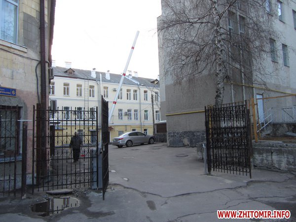 Охранник стоянки рассказал Житомир.info, что к моменту окончания сессии горсовета 29 марта здесь было около 6 машин. По его словам, шлагбаум устанавливали ночью накануне сессии, а раньше он стоял на въезде с улицы Лятошинского на пешеходную улицу Михайловскую.