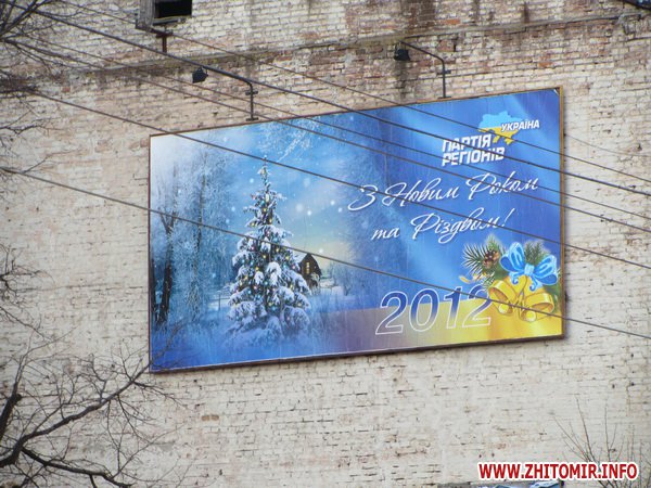 Из партийных поздравление в центре города можно увидеть пасхальные яйца от политической партии УДАР и поздравление… с Новым 2012 годом и Рождеством от Партии регионов. Видимо из-за того, что билборд размещен не вдоль дороги, а на торце одного из домов на ул.Киевской, о нем просто забыли…