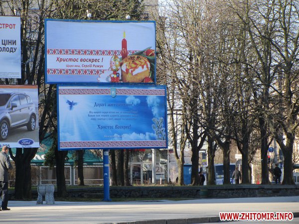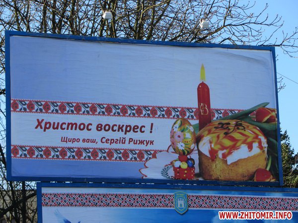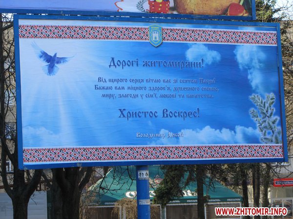 Традиционно в центре города, на билбордах возле драмтеатра – поздравление Сергея Рыжука. Житомирский губернатор лаконичен: «Христос воскрес! Щиро ваш, Сергій Рижук». Рядом – более многословное поздравление мэра, на этот раз без фотографии Владимира Дебоя, но с парящим в голубом небе голубем.