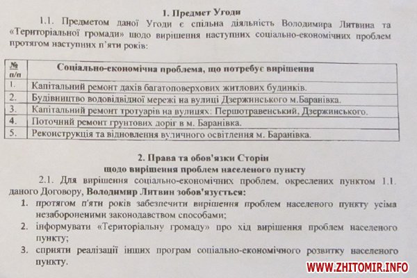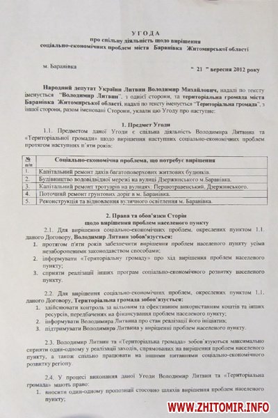 Предметом договора является совместная деятельность Литвина и местной общины по решению социально-экономических проблем в течении следующих 5 лет. Договор скреплен печатью Барановского горсовета, подписан 21 сентября 2012 года и действует до 31 декабря 2017 года.