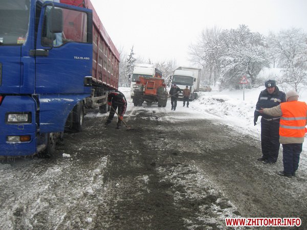 Коростышевский район – далеко не единственный в Житомирской области, где для оказания помощи водителям транспортных средств активно привлекается «тяжелая артиллерия». В Попельнянском районе на участке автодороги Житомир - Сквира постоянно дежурит наряд ГАИ, ведь по этой дороге движутся дальнобойщики. На скользкой дороге груженая фура, как правило, не может преодолеть крутой подъем. Чтобы помочь водителям, на этом участке автодороги, гаишники организовали контроль за постоянной обработкой дорожного полотна песком. Вместе с гаишниками дежурят и дорожные службы, которые имеют в распоряжении спецавтомобили и тракторы, с помощью которых в случае необходимости и проводится спасение крупногабаритного транспорта.