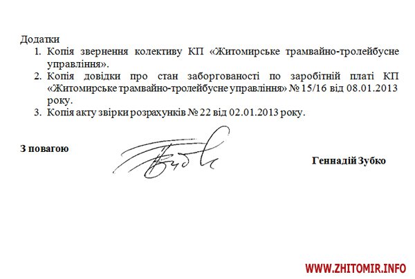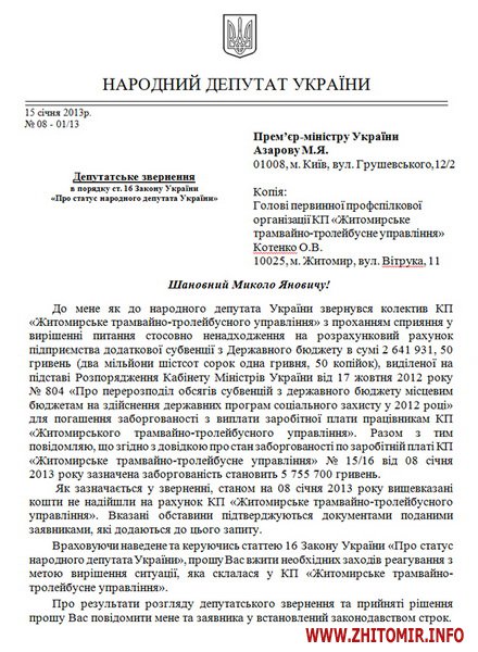 «Згідно з довідкою про стан заборгованості по заробітній платі КП «Житомирське трамвайно-тролейбусне управління» від 08 січня 2013 року зазначена заборгованість становить 5 755 700 гривень», - йдеться у зверненні депутата.