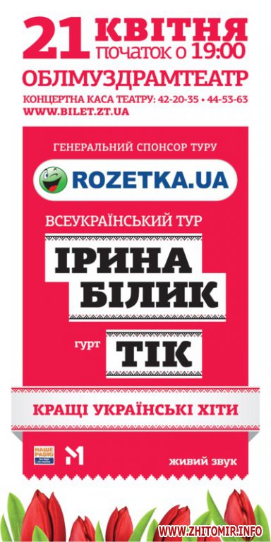 21 апреля в рамках тура «Лучшие украинские хиты» в Житомир с концертом приедут Ирина Билык и группа «ТИК», - сообщает Афиша Житомира.