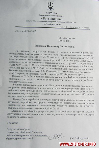 «На заседании депутатской комиссии по вопросам жилищно-коммунального хозяйства, благоустройства и экологии было проанализировано состояние выполнения договора аренды земли, которым предусматривалось обустройство пяти спортивных площадок в школах № 19, 7, 26, 8, 32 и возобновление баскетбольной площадки в школе №8 общей стоимостью 2 млн. 211 тыс. 932 грн., подписанный Вами лично и завизированный Вашими подчиненными. По состоянию на 1 апреля 2013 года действие договора закончилось. Работы не выполнены, акты приема-передачи объектов отсутствуют и не поставлены на баланс балансодержателями», - говорится в письме.