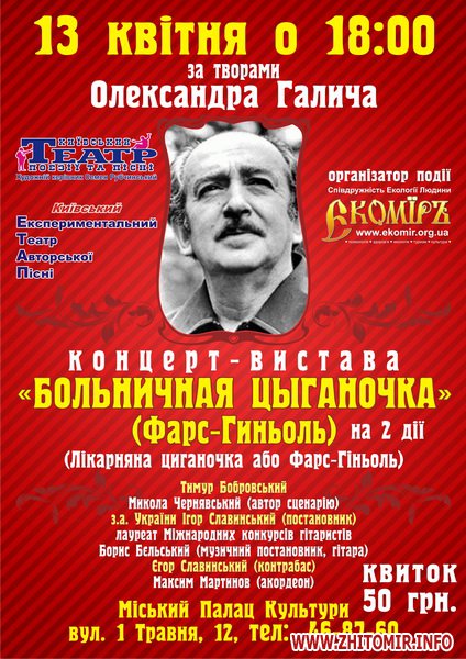 13 квітня в Житомирському міському палаці культури бардівський театр покаже виставу за творами Олександра Галича, - повідомляє Афіша Житомира.
