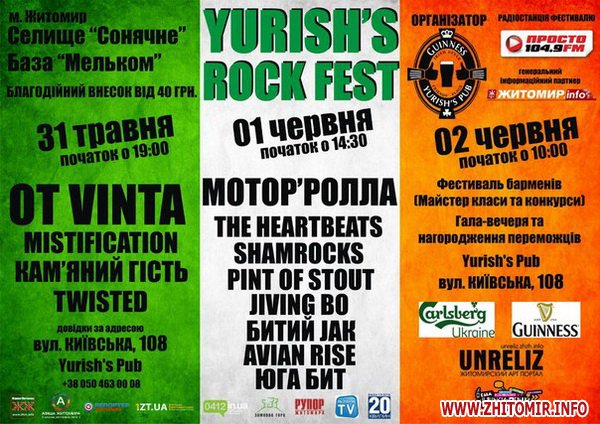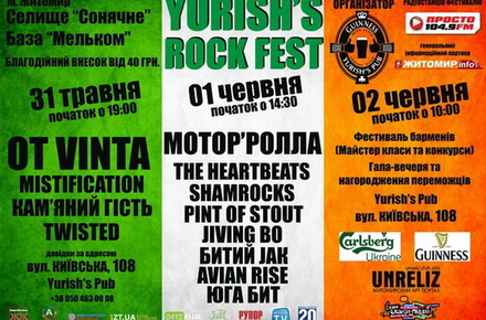 С 31 мая по 2 июня под Житомиром, возле поселка Солнечное, пройдет оупен-эиррок фестивальYurish'sRockFest, который на своей сцене объединит рок-музыкантов из пяти областей Украины. Сцена фестиваля будет располагаться на берегу озера, а сам фестиваль будет проходить на территории базы «Мельком». Организаторам фестиваля является Ирландский паб.