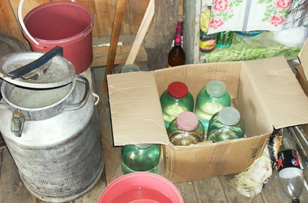 Прямо в гараже было налажено производство: в ведрах и бидонах готовилась закваска, здесь проходил процесс изготовления самогона, здесь же стояла подготовленная посуда для разлива готового продукта.