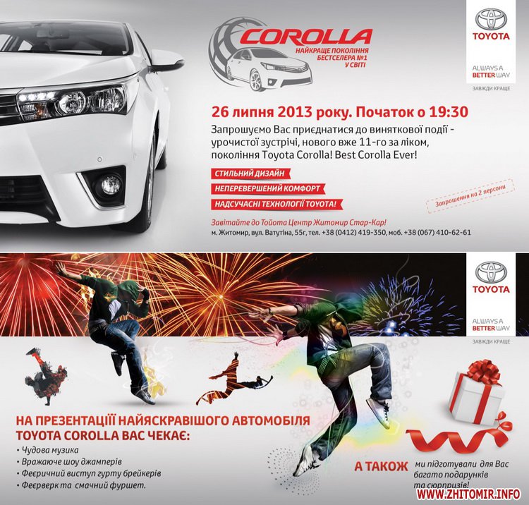 У цей день на всіх гостей свята чекає неймовірна шоу-програма з сучасною музикою, вражаючими виступами джамперів та брейкерів, яка завершиться грандіозним феєрверком. Жодна визначна подія в Тойота Центр Житомир Стар-Кар не обходилась без подарунків, і зустріч нової Toyota Corolla – не стане виключенням. Безліч цінних призів та приємних сюрпризів уже чекають на Вас.