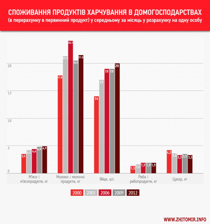За один місяць 2012 року кожен мешканець Житомирської області з’їв в середньому 4,9 кг м’яса і м’ясопродуктів, 21,5 кг молока і молочних продуктів та 1,9 кг риби та рибопродуктів.