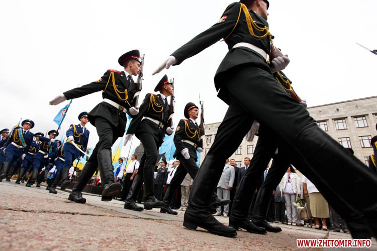 Впереди, выстроенные в несколько колон, шли военные, за ними оркестр, руководство Житомира и области, а за ними молодые люди в вышиванках с флагами в руках. К сожалению, люди несли в руках всего 10 сине-желтых флагов и около 30 флагов Партии регионов.