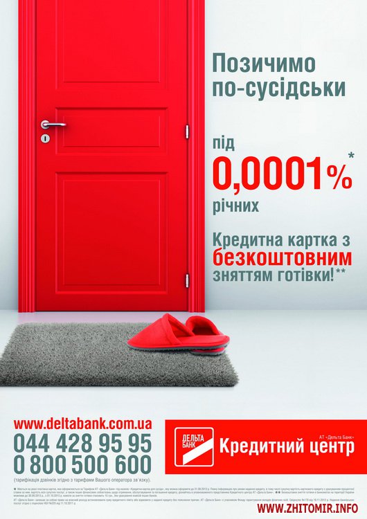 * Мається на увазі платіжна картка, що оформлюється за Тарифом АТ «Дельта Банк» під назвою «Кредитна картка для сусіда», яку можна оформи до 31.08.2013р. Повну інформацію про умови надання кредиту, в тому числі сукупну вартість карткового кредиту з урахуванням процентної ставки за ним, вартість всіх супутніх послуг, а також інших фінансових зобов’язань щодо отримання, обслуговування та погашення кредиту, дізнайтесь в уповноваженого представника Кредитного центру АТ «Дельта Банк». АТ «Дельта Банк» залишає за собою право вимагати надання додаткових документів для визначення платоспроможності позичальника, на власний розсуд встановлювати суму кредитного ліміту або відмовити у наданні кредиту без пояснення причин.