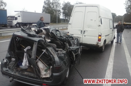 29 августа около 14.50 на 210 км автодороги Киев-Чоп в Новоград-Волынском районе водитель автомобиля Форд-Транзит, 46-летний житель Житомира, въехал в автомобиль ВАЗ-21114, под управлением 54-летнего жителя г. Новоград-Волынский, который двигался в попутном направлении. После этого Лада столкнулась с припаркованным на обочине грузовиком ДАФ.
