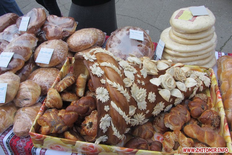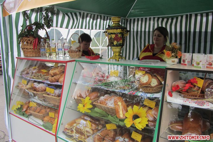 От арки и до подвесного моста расположились палатки хлебопеков Житомира и области: каждый представляет свою продукцию с обязательным «рогом изобилия» и караваем.