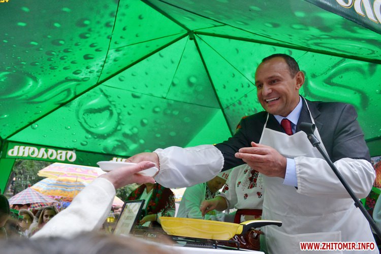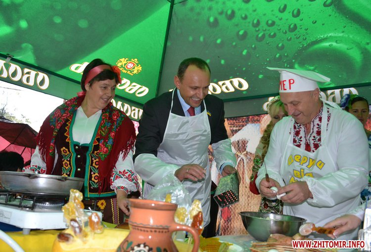 Володимир Анатолійович виступив не лише спонсором фестивалю, а й активним його учасником. Він не тільки куштував деруни від мера, але й охоче підключився до майстер-класу, щоб особистим прикладом разом з мером вчити молодих господарок-наречених готувати смачні деруни.