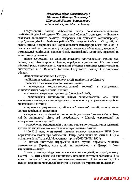 Народний депутат звертається до керівників правоохоронних, контролюючих структур, органів місцевої влади з проханням перевірити достовірність фактів, оприлюднених у програмі телеканалу «НТН» «Агенти впливу» щодо порушення прав дітей, які перебувають у закладі соціального захисту, що розташований у селі Великий Кобилин Овруцького району.