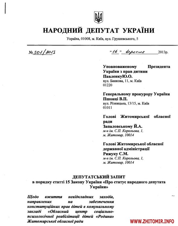 На пленарному засідання Верховної Ради України 20 вересня було проголошено депутатський запит народного депутата України Володимира Пехова від 16.09.2013 р. на ім’я Уповноваженого Президента України з прав дитини Юрія Павленка, Генерального прокурора України Віктора Пшонки, голови Житомирської облради Йосипа Запаловського та голови Житомирської облдержадміністрації Сергія Рижука «Щодо вжиття невідкладних заходів, направлених на забезпечення конституційних прав дітей в комунальному закладі «Обласний центр соціально-психологічної реабілітації дітей «Родина» Житомирської обласної ради».