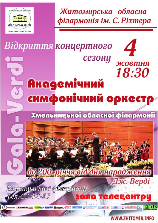 Концертна програма до 200-річчя від Дня народження видатного італійського композитора Джузеппе Верді прозвучить у виконанні академічного симфонічного оркестру Хмельницької обласної філармонії. У програмі прозвучить оркестрова музика, а також арії зі знаменитих опер «Аїда», «Ріголетто», «Травіата», «Набукко», «Сила долі».