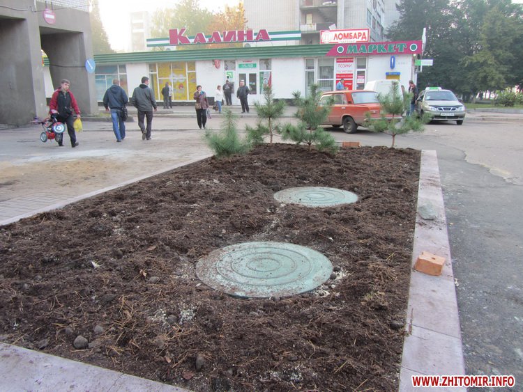 В Житомире в микрорайоне Полевая, между ТК «Семейный» и магазином «Калина», прямо на проезжей части появился зеленый оазис - клумба с хвойными деревьями.