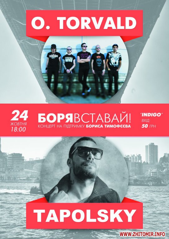24 октября в Житомире состоится благотворительный концерт "Боря, вставай!" при участии рок-группы O.TORVALD и DJ TAPOLSKY, - сообщает "Афиша Житомира".