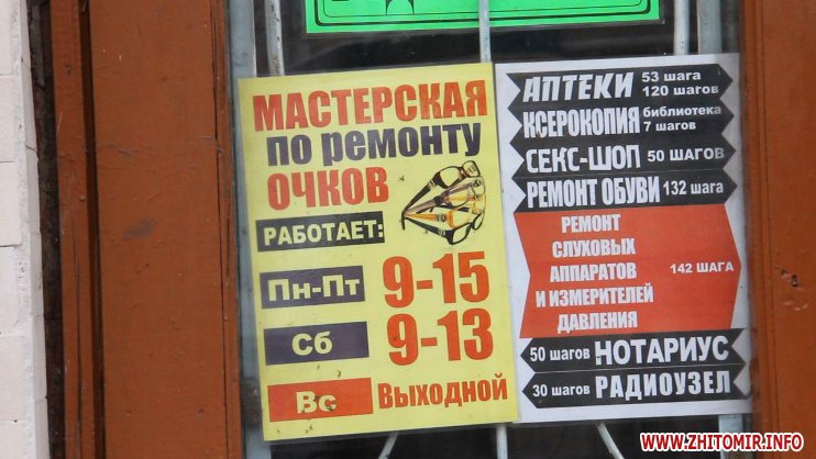 Майстер з ремонту окулярів постійно підтримує спортивну форму та не втрачає почуття гумору: вивішує в дверях та в майстерні оголошення, які викликають посмішку відвідувачів.