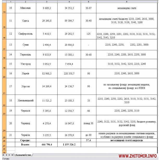 Объем заблокированных средств, в частности, Одессы составил более 89,3 млн грн, Запорожья - 62,9 млн грн., Львова - 41,8 млн грн., Луганска – 34,44 млн грн., Николаева – 34,35 млн грн., Симферополя - 29,3 млн грн., Кировограда - 27,9 млн грн., Чернигова - 26,4 млн грн., Житомира - 26,3 млн грн., Херсона - 24,1 млн грн., Хмельницкого - 23, 1 млн грн., Сум - 20,9 млн грн., Ивано-Франковска – 17,68 млн грн., Черновцов - 16 млн грн., Винницы - 13,6 млн грн., Тернополя - 13,4 млн грн., Черкасс - 12,3 млн грн., Ужгорода – 7,45 млн грн.