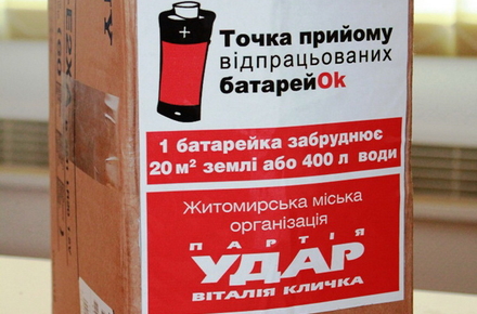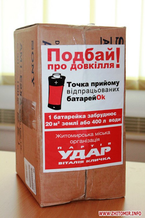 Житомирський «УДАР» продовжує збір використаних або зіпсованих батарейок і закликає житомирян не лінуватися донести їх до найближчого пункту прийому. Якщо Ви бажаєте встановити спеціальний контейнер у своєму магазині чи офісі, звертайтеся до Житомирської міської організації партії «УДАР» за адресою: пров. Львівський, 2, оф. 28.