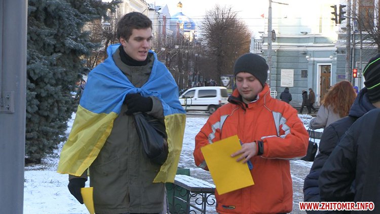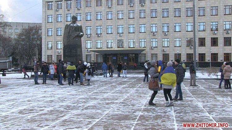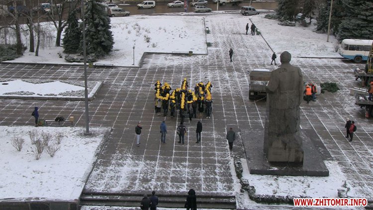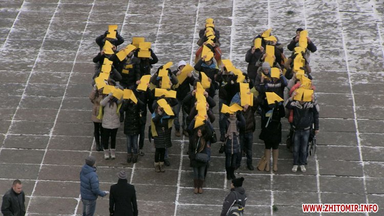 Близько 60 студентів влаштували флеш-моб біля Житомирської облдержадміністрації. Учасники акції вишикувались у формі національного гербу України та слів «Яник геть».