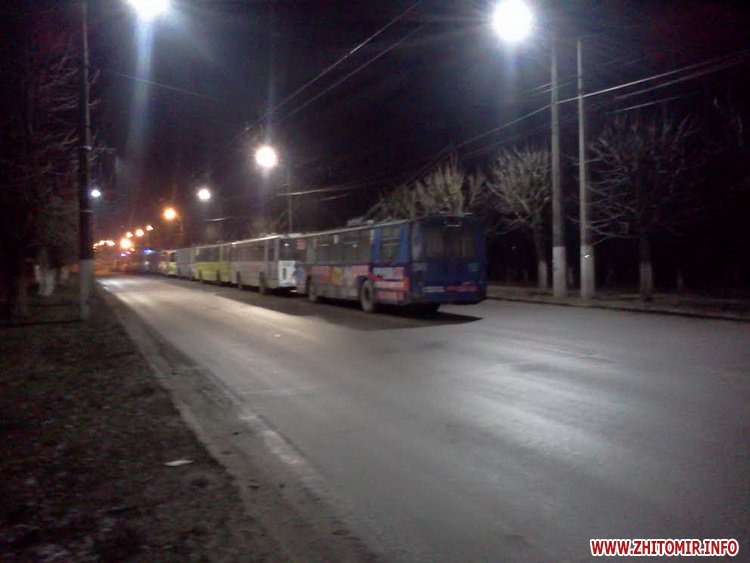 В редакцию Житомир.info обратился читатель, который рассказал, что 24 декабря поздним вечером на Полевой в Житомире около двух десятков троллейбусов по непонятным причинам выстроились в колонну посреди дороги.