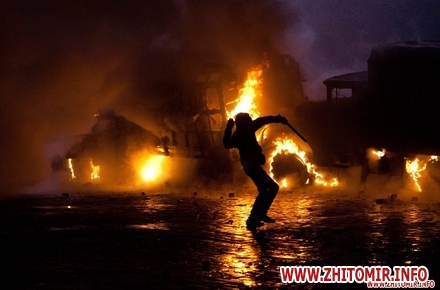 Обгорілі чорні скелети беркутівських автобусів стоять біля стадіону. Людей поменшало, але вони радикалізувалися. Близько 100 людей щойно стояли під струєю з водомету, не тікаючи. На вулиці температура - мінус 10. Це означає, що серед протестувпльників - ще мінус 100 людей. І водомет не вгамовується у своїх специфічних "водохрещах". На черзі - наступні 100.