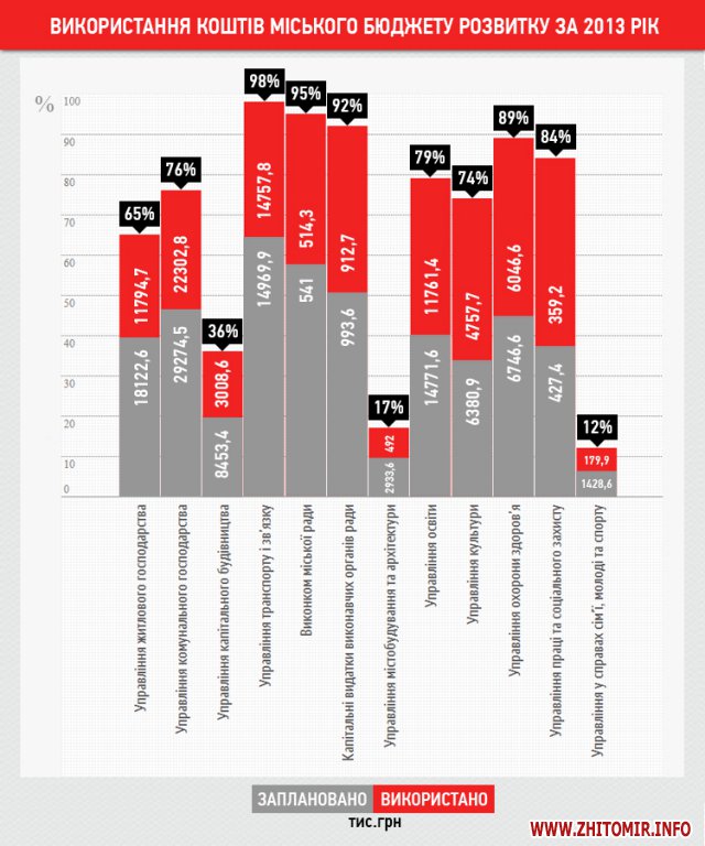 В 2013 году из бюджета развития Житомира ни одна отрасль не была профинансирована на 100%, а более 90% от запланированных средств получили только исполком горсовета и управление транспорта и связи.
