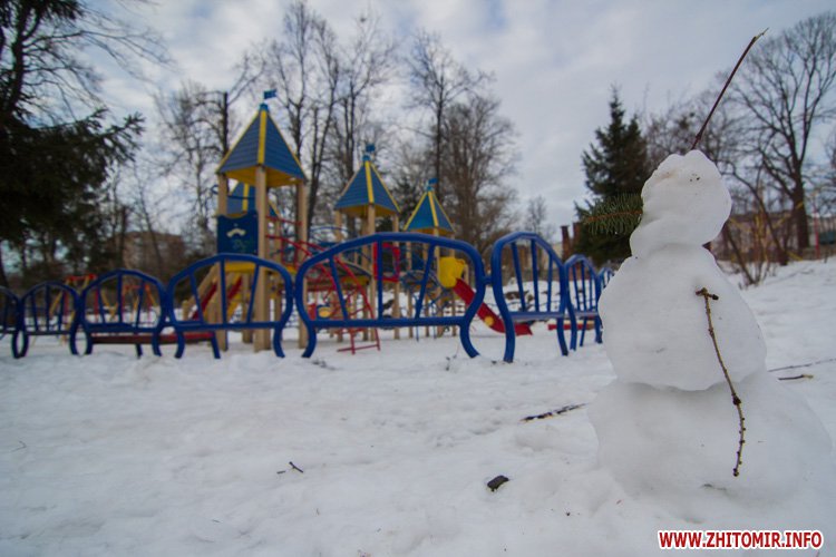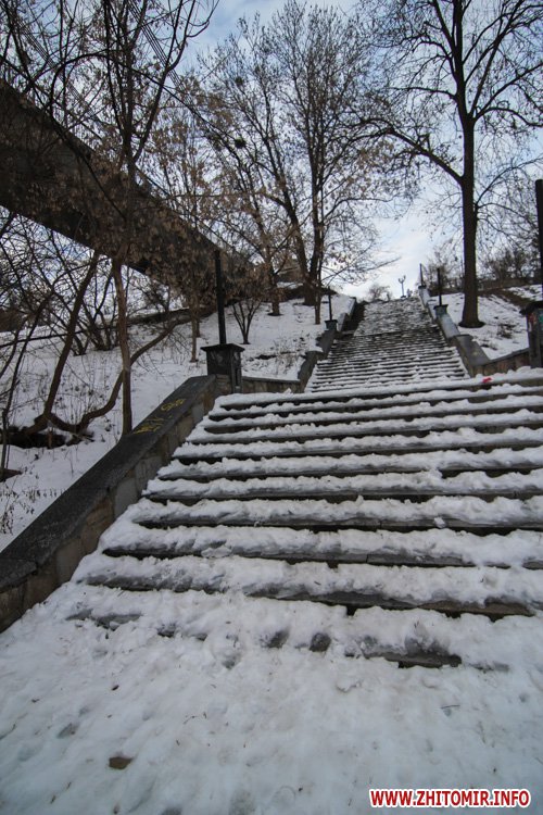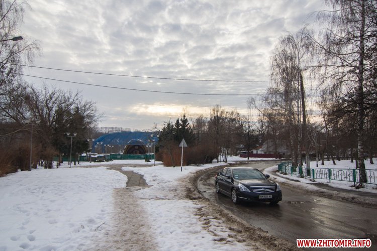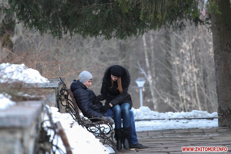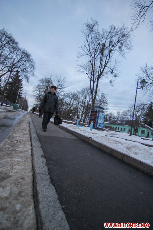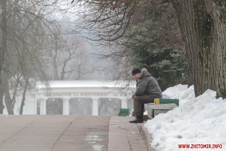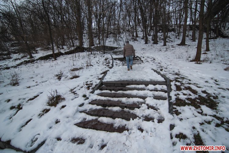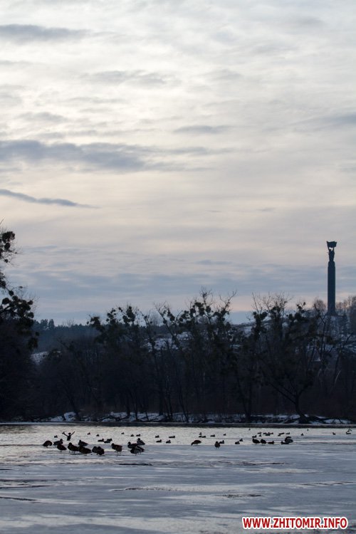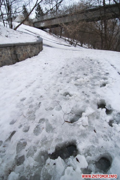 Снег, выпавший в Житомире в конце января, уже практически растаял на городских дорогах и тротуарах. Правда, о нем еще напоминают лужи под ногами и грязные сугробы у обочин. А вот в парке культуры и отдыха им. Гагарина, где посетителей в это время года совсем немного, мокрый снег неубранным ковром лежит на аллейках, тропинках и ступеньках. Не успел растаять и лед на реке Тетерев, которую "оккупировали" дикие утки и любители зимней рыбалки.