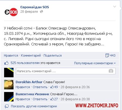 «У Небесній сотні - Балюк Олександр Олександрович, 19.03.1974 р.н., Житомирська обл., Новоград-Волинський р-н, с. Липовий. Рідні сьогодні опізнали його тіло в морзі на Оранжерейній. Спочивай з миром, Герою! Не забудемо...», - йдеться у повідомленні.