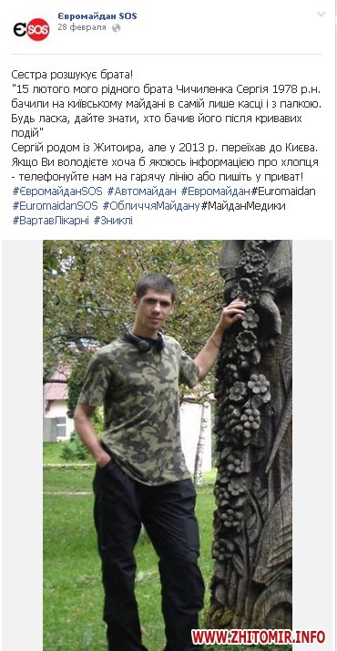 Також 28 лютого на сторінці Євромайдан SOS з’явилась інформація про розшук зниклого житомирянина – Сергія Чичиленка, 1978 року народження. Востаннє чоловіка бачили на Майдані 15 лютого.