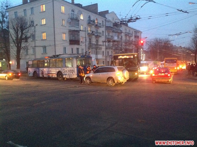4 марта в центре Житомира легковой автомобиль Chery въехал в троллейбус. ДТП произошло около 17.45 на перекрестке улиц Театральная и Киевская.
