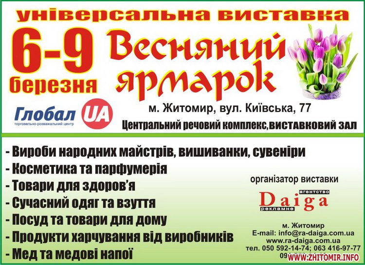 Напередодні 8 Березня у Житомирі стартував універсальний Весняний ярмарок. Це гарна нагода для тих, хто ще не визначився з подарунками для чарівних жінок. Адже з 6 по 9 березня у виставковому залі ТРЦ «Глобал UA» буде представлений широкий вибір косметики, парфумерії, товарів для здоров’я, виробів народних майстрів, сувенірів, а також вишиванок, одягу, взуття.