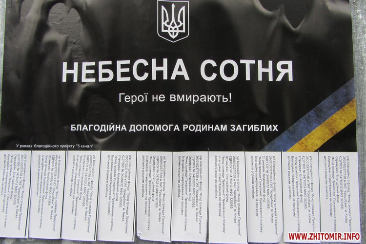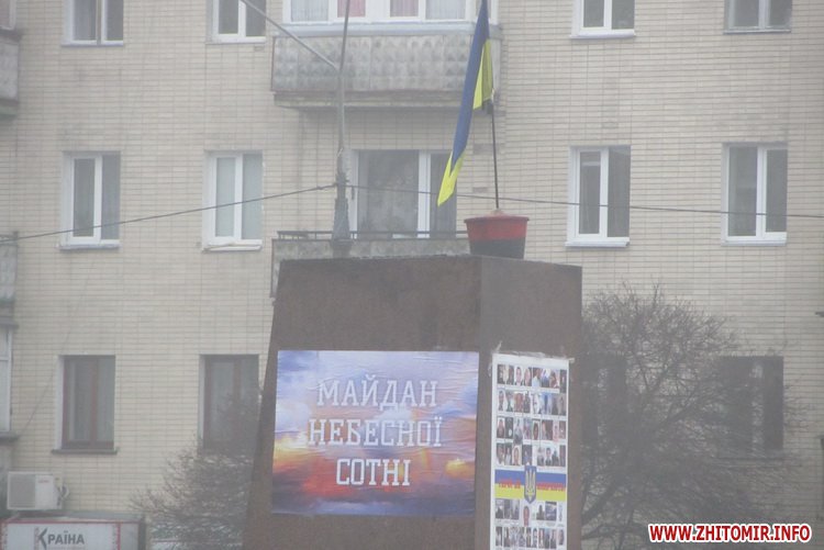В центре Житомира, на площади Соборной, один из билбордов напоминает о героях Небесной сотни, а на постаменте бывшего памятника Ленину – плакат «Майдан Небесной сотни».