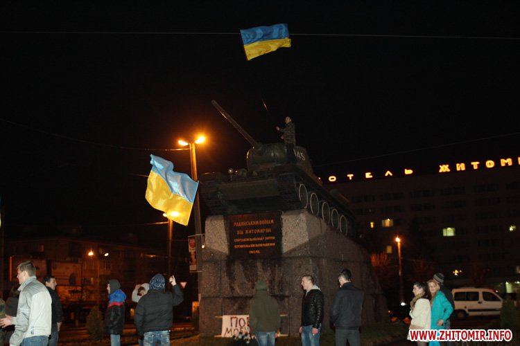 Кілька десятків людей пройшли від майдану Корольова до майдану Соборного і далі – на майдан Перемоги, де встановили український прапор на танк Т-34.