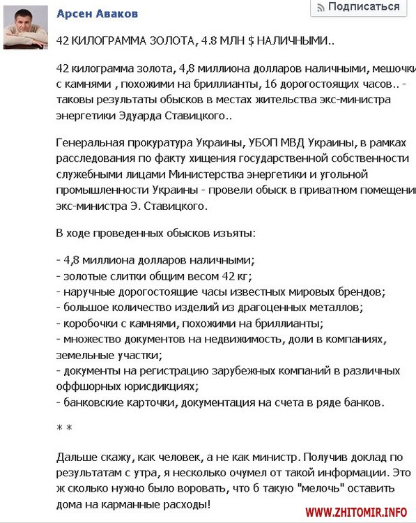 «42 килограмма золота, 4,8 миллиона долларов наличными, мешочки с камнями, похожими на бриллианты, 16 дорогостоящих часов.. - таковы результаты обысков в местах жительства экс-министра энергетики Эдуарда Ставицкого», - сообщил Аваков.