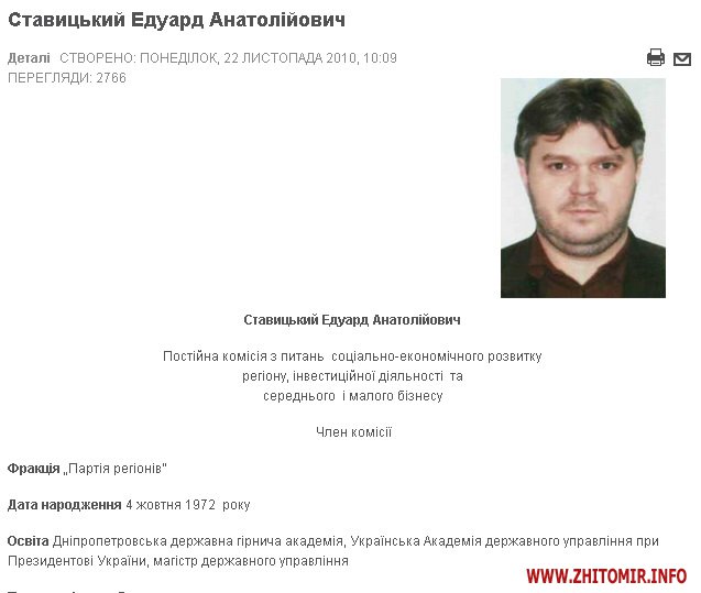 Напомним, что Эдуард Ставицкий - депутат Житомирского областного совета 6 созыва (с ноября 2010 года), член Постоянной комиссии по вопросам Чернобыльской катастрофы, экологии и использования природных ресурсов. Фракция Партии регионов.