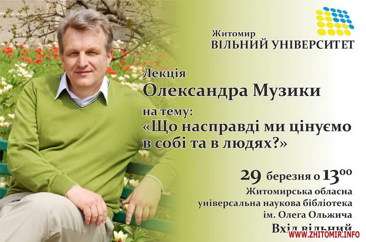 В рамках проекту Вільний університет Житомира 29 березня у обласній бібліотеці відбудеться лекція заступника директора Інституту психології ім. Г.С.Костюка НАПН України з науково-організаційної роботи, професора, автора 125 наукових та науково-методичних праць Олександра Музики на тему «Що насправді ми цінуємо в собі та в людях?»