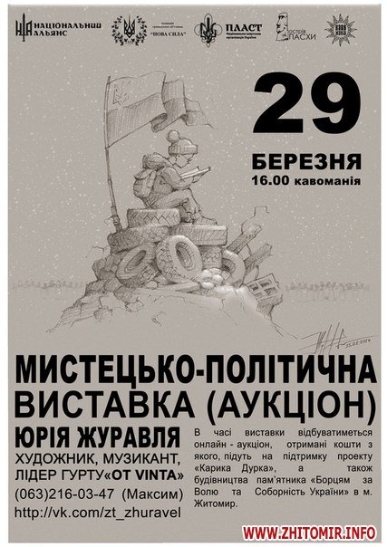 «Вперше в Житомирі виставка мистецько-політичних робіт художника, музиканта, лідера гурту «ОТ ViNTA» Юрія Журавля. В день відкриття виставки відбудеться також зустріч з автором,в ході якої усі бажаючі матимуть можливість поспілкуватись з митцем та обговорити його творчість», - запрошують організатори.