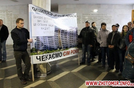 10 квітня кілька десятків людей вийшли пікетувати сесію Житомирської облради. Люди які вклали гроші у зведення багатоповерхівки на Щорса, 155 скаржаться: мали заселитися у квартири ще 7 років тому, але досі змушені чекати.