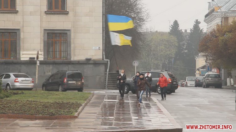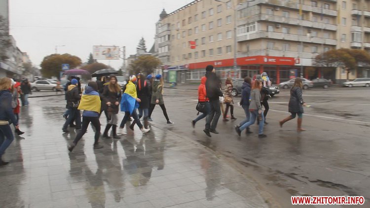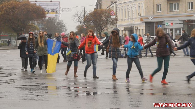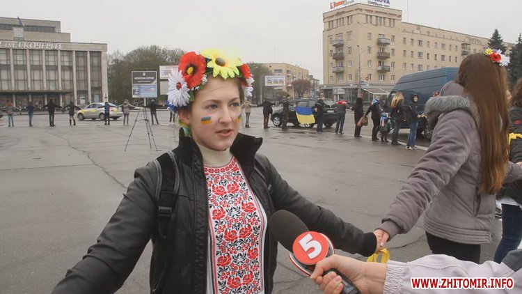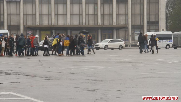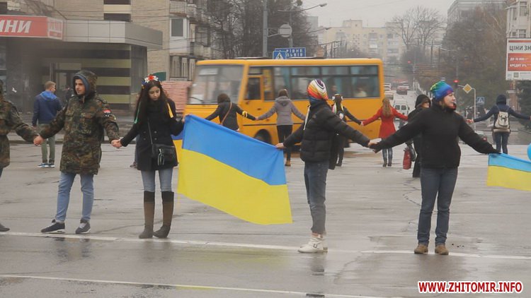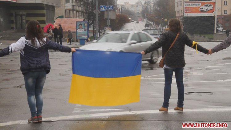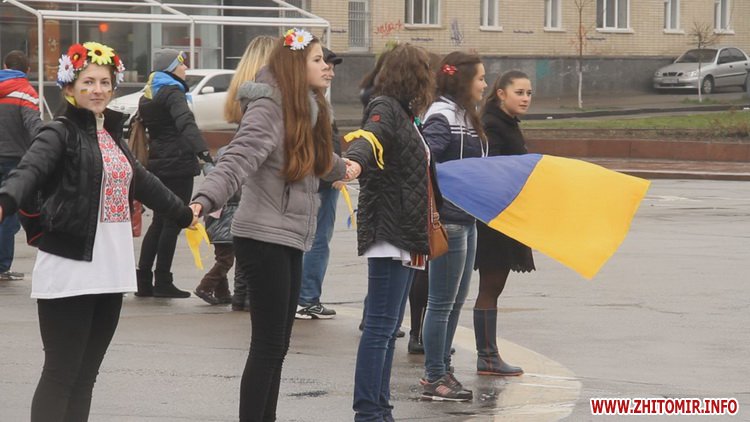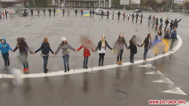 12 квітня у Житомирі пройшла акція «Ланцюг Єднання». Не зважаючи на сиру погоду, близько сотні молодих людей з державними прапорами зібралися на площі Соборній, аби висловити свою підтримку миру та єдності України.
