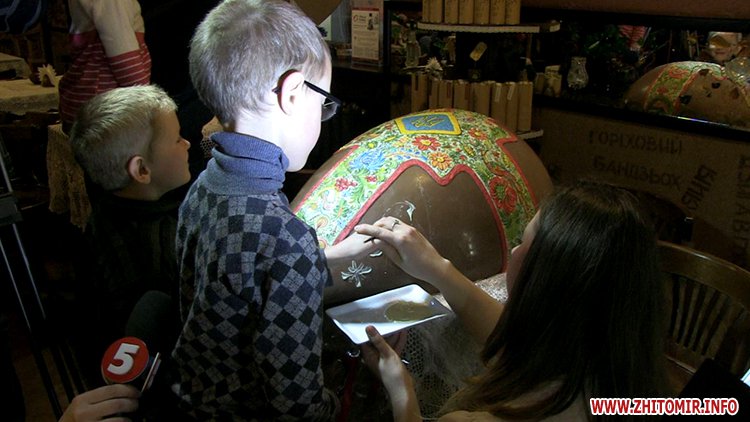 Це вже третя мегаписанка, яку розмальовують у Житомирі. Цього року шоколадне яйце оздоблювали петриківськими візерунками та українськими символами. Майстри зізнаються: шоколадна писанка викликала у житомирян неабиякий інтерес, тож художники залишили місце, щоб кожен охочий міг домалювати свій оберіг